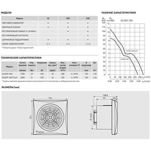Максимальный расход воздуха составляет 280 м3/ч. Вентиляторы предназначены для присоединения к воздуховодам диаметром 150 мм.