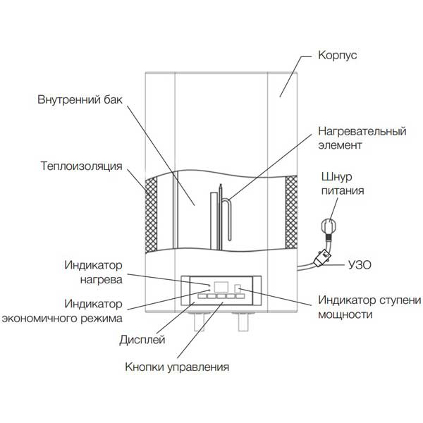 На лицевой панели водонагревателя расположена удобная электронная панель управления, с помощью которой можно задать нужную температуру нагрева воды в диапазоне от 30 до 75°С. При выборе на панели управления функции экономного режима (положение «ЕCO»), вода будет нагреваться до температуры 55°С. При такой температуре повышается рабочий ресурс ТЭНа, происходит обеззараживание воды и практически не образуется накипь.